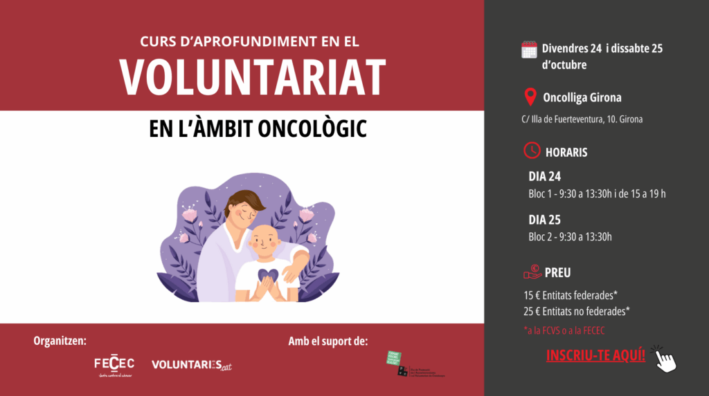 Els pròxims 24 i 25 d’octubre tindrà lloc a Girona una nova edició del Curs d’aprofundiment en el voluntariat en l’àmbit oncològic, formació dreçada a persones voluntàries que ja tenen experiència desenvolupant la seva actuació en el camp de l’oncologia i de l’acompanyament a persones amb càncer. Inscripcions en aquest enllaç!