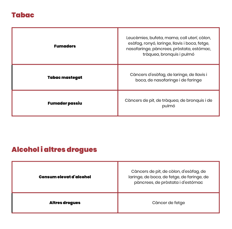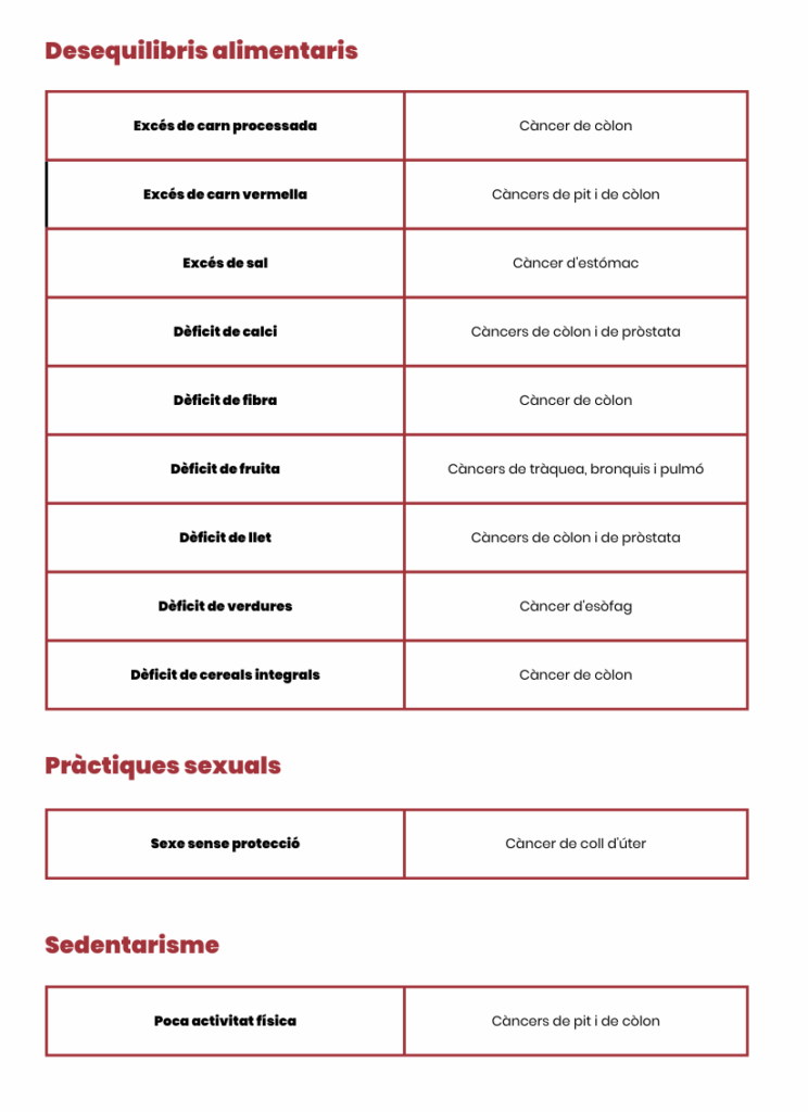 Aquest és el llistat de factors de risc evitables i els tipus de càncer associat: