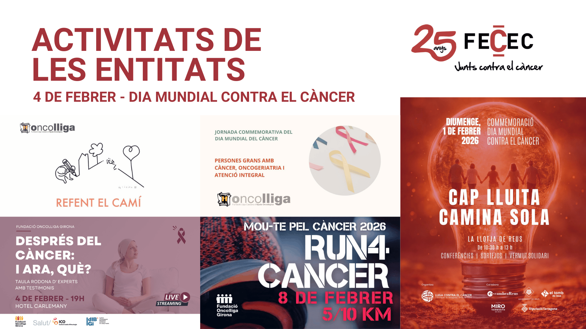 Les entitats de la FECEC es preparen aquests dies per celebrar el Dia Mundial contra el Càncer (4 de febrer). Per això, organitzen una sèrie d'activitats que us compartim a continuació.