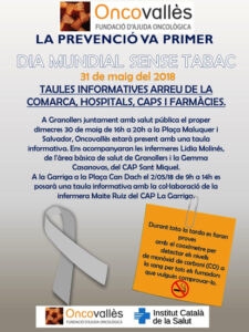 Oncovallès organitza una taula informativa el dia 30 en motiu del Dia Mundial Sense Tabac