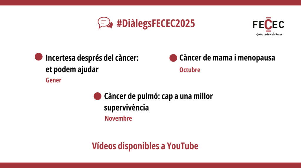El passat novembre, la FECEC Junts contra el Càncer va cloure el seu Cicle Diàlegs FECEC 2025, xerrades divulgatives on hem parlat dels diferents aspectes de la malaltia amb experts i testimonis. Aquest 2025 s’ha parlat sobre la incertesa, el càncer de mama i el de pulmó.