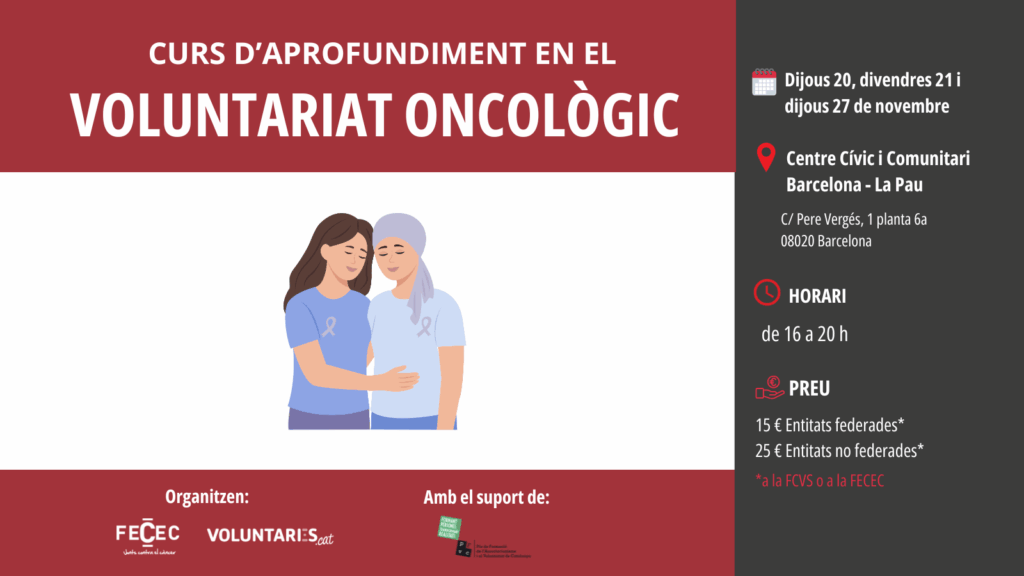 En el mes de noviembre tendrá lugar en Barcelona una nueva edición del Curso de profundización en el voluntariado en el ámbito oncológico, formación dirigida a personas voluntarias que ya tienen experiencia desarrollando su labor en el campo de la oncología y del acompañamiento a personas con cáncer. ¡Inscríbete en este enlace!