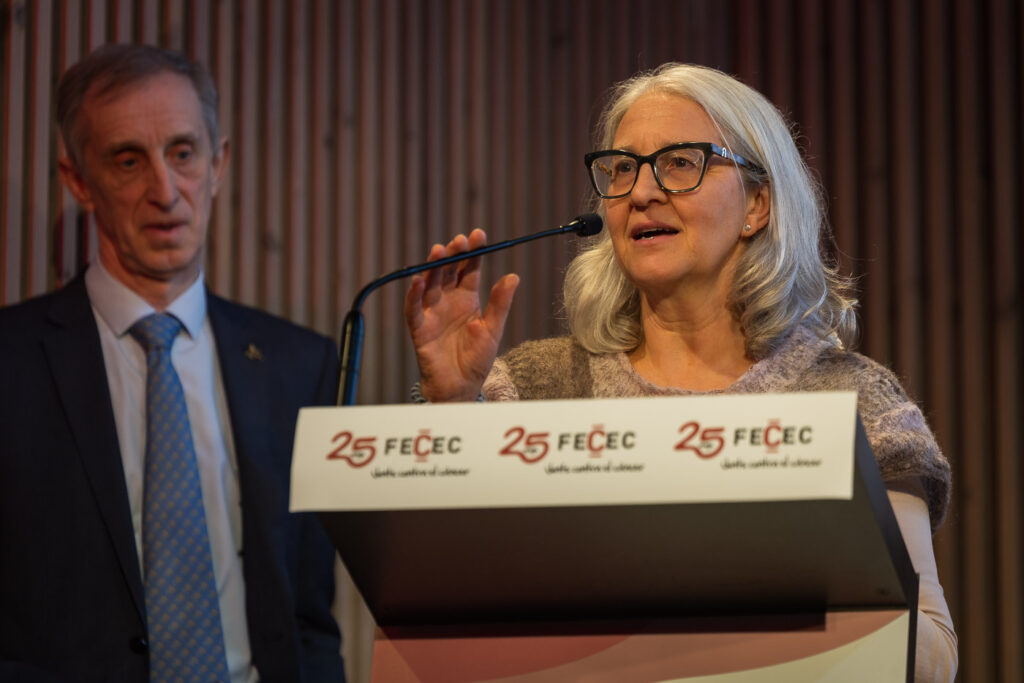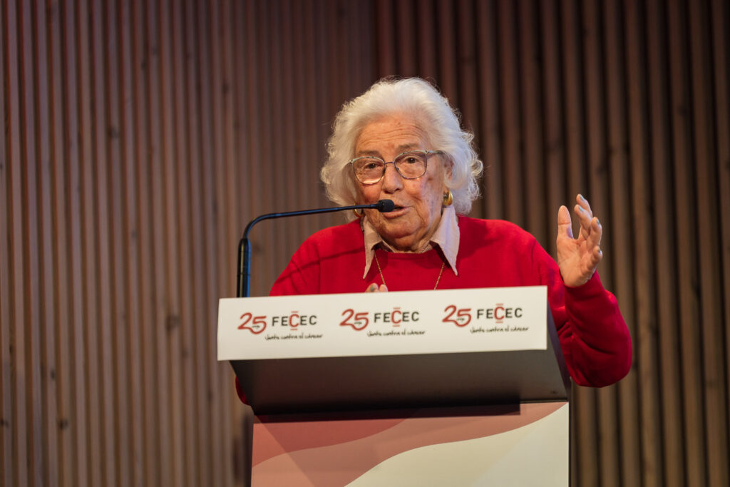 Posteriormente, la gerente de la FECEC Junts Contra el Càncer, Clara Rosàs, hizo un repaso a estos 25 años, realizando una mención especial de recuerdo a los presidentes de honor de la entidad, Carles Carcolé, Josep Morell y el Dr. Ramon M.ª Miralles. En esta mirada global de los retos alcanzados, también hubo espacio para destacar la especial incidencia de la entidad en dos de los aspectos relevantes de la etapa posterior al cáncer: el retorno progresivo al trabajo y el derecho al olvido oncológico.