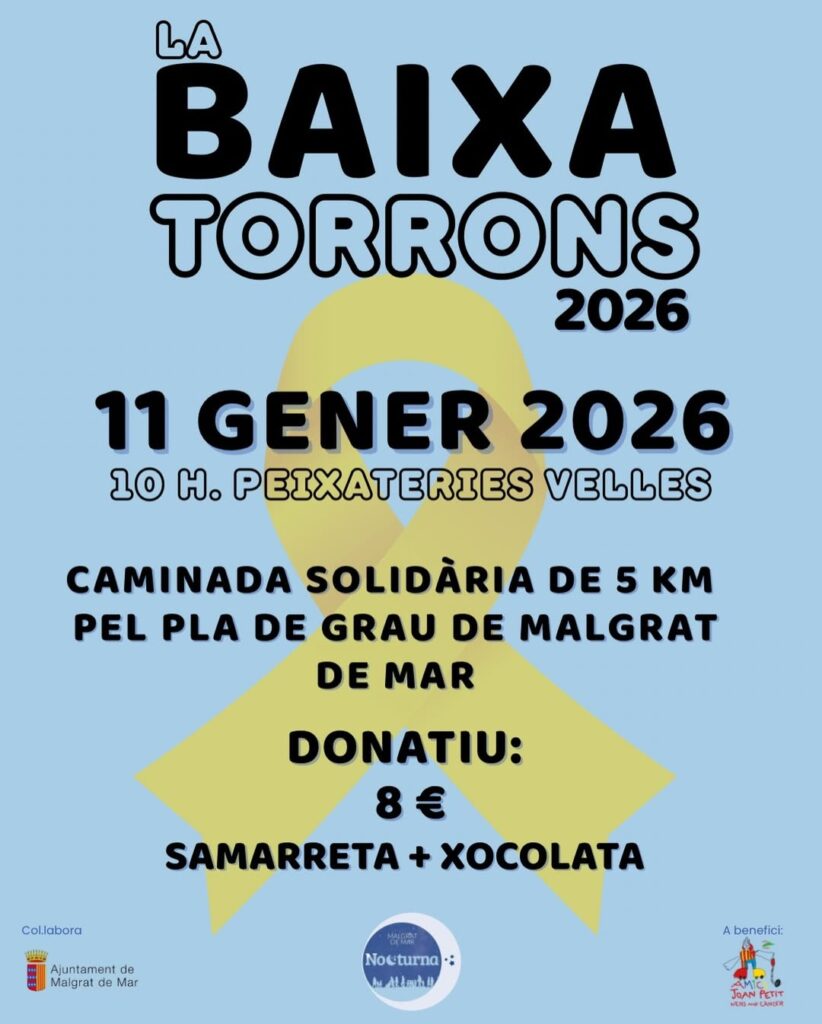 La BaixaTorrons 2026 en benefici de la Fundació Amics Joan Petit Nens amb Càncer se celebrarà el diumenge 11 de gener de 2026. Nocturna Malgrat organitza l’activitat.
