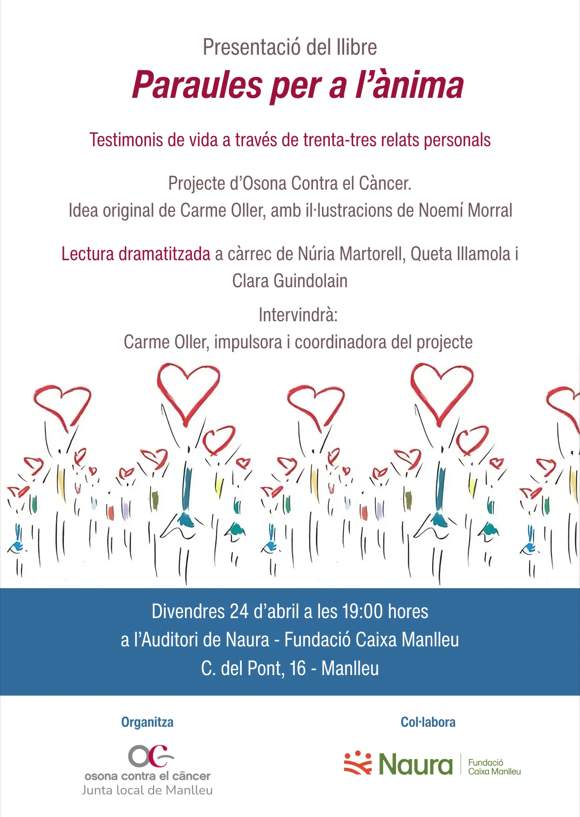 Manlleu acull el pròxim 24 d’abril la presentació del llibre Paraules per a l’ànima, on trenta-tres pacients de càncer relaten els seus testimonis convivint amb la malaltia.