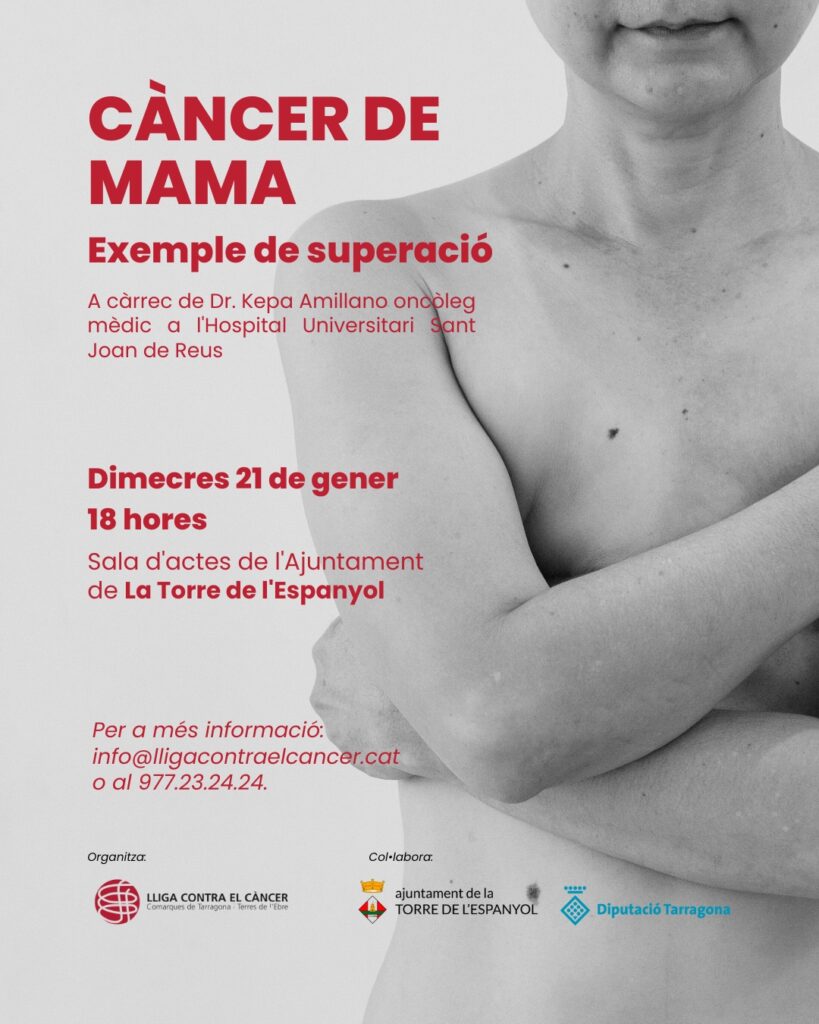 La Lliga contra el Càncer de Tarragona i les Terres de l’Ebre organitza la xerrada “Càncer de mama: exemple de superació” a La Torre de l’Espanyol el pròxim 21 de gener.